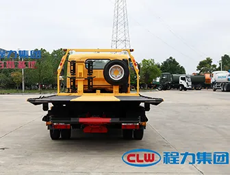 7-ton superstructure, rear hydraulic flip plate, through-axle hinge connection, dual-side linkage operation device, separate gantry frame; 5mm tread plate sunken flatbed, plate length 5.8 meters (main plate length 4.15 meters including hinge, tail plate length 1.65 meters), full open track holes; 14mm solid steel frame, frame sunk with bottom holes; 10mm thick manganese steel slide rails, double beams, grid pattern, extended and densely reinforced triangular supports; 110 main hydraulic cylinder, 110 lifting cylinder, rear support arm 110 lifting hydraulic cylinder, 4-ton hydraulic winch, 21-meter steel wire rope, winch sunk; 6-ton two-section rear support arm, rear support arm mounted on main beam.